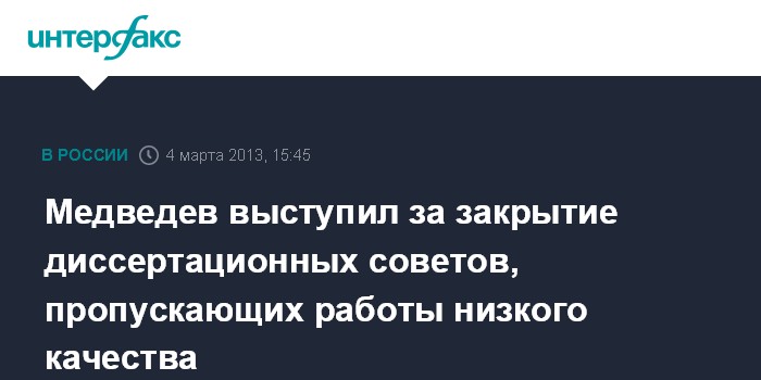 "Нужно посмотреть самым пристальным образом на саму систему подготовки и аттестации научных кадров, для того чтобы объективно оценить научных потенциал страны. К сожалению, в целом ряде диссертационных советов качество работ, которые они пропускают, - просто ужасное. Такие диссертационные советы должны быть закрыты", - заявил Медведев на совещании с вице-премьерами в понедельник.