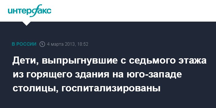 Москва. 4 марта. INTERFAX.RU - Дети, выпрыгнувшие из окна седьмого этажа при пожаре на юго-западе Москвы, госпитализированы в Морозовскую и Филатовскую больницы, сообщили в пресс-службе столичного департамента здравоохранения.