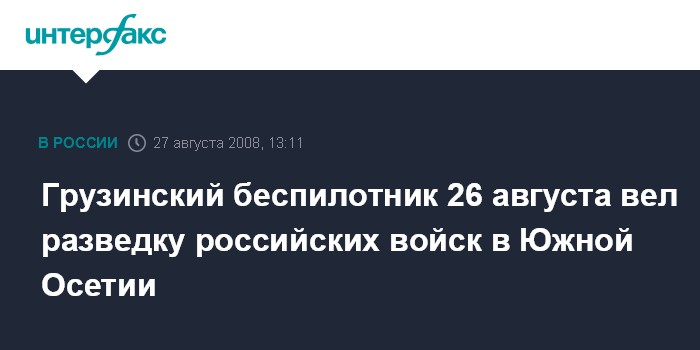 Москва. 27 августа. INTERFAX.RU - Грузинский беспилотник в минувший вторник в нарушение существующих договоренностей проводил разведку над Южной Осетией, сообщают в Генштабе ВС РФ.