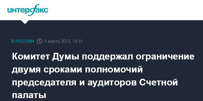 Москва. 5 марта. INTERFAX.RU - Комитет Госдумы по бюджету и налогам на заседании во вторник поддержал поправку в проект новой редакции закона о Счетной палате России, которая ограничивает двумя сроками полномочия председателя палаты, его заместителя и аудиторов.