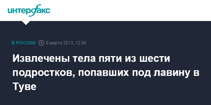 Москва. 6 марта. INTERFAX.RU - В горах Тувы из-под снежной лавины извлечены тела еще двоих погибших, сообщили "Интерфаксу" в МЧС России.