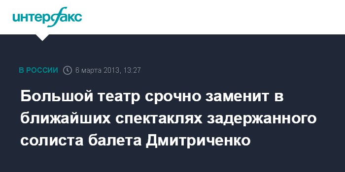 Москва. 6 марта. INTERFAX.RU - Первая замена солиста балета Большого театра Павла Дмитриченко в спектакле произойдет 16 марта, сообщили в среду "Интерфаксу" в пресс-службе театра.