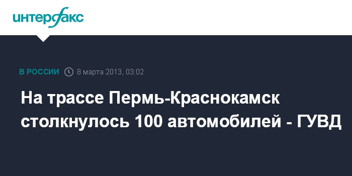 Пермь. 8 марта. ИНТЕРФАКС-ПОВОЛЖЬЕ - Из-за плохих погодных условий на трассе Пермь-Краснокамск вечером седьмого марта столкнулось сто автомобилей, сообщил агентству "Интерфакс-Поволжье" представитель ГУ МВД по Пермскому краю.