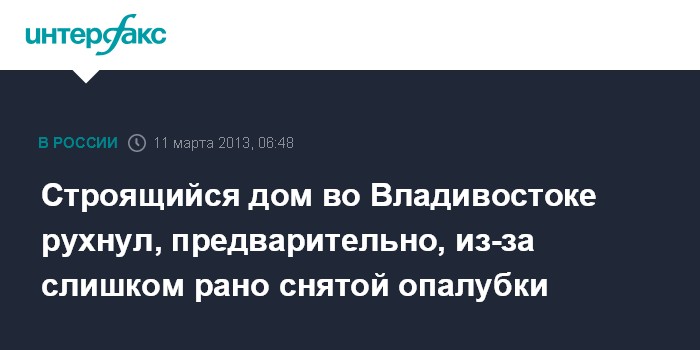 Строящийся дом во Владивостоке рухнул, предварительно, из-за слишком рано снятой опалубки