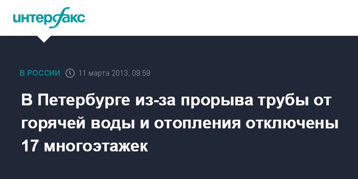 Санкт-Петербург. 11 марта. INTERFAX.RU - В Санкт-Петербурге в понедельник в результате прорыва трубы от горячего водоснабжения и отопления временно отключены 17 многоэтажных домов, сообщили "Интерфаксу" в пресс-службе ГУП "ТЭК СПб".