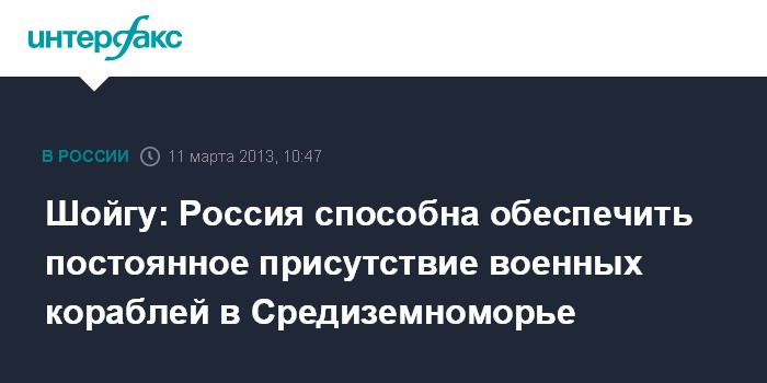 Москва.11 марта. INTERFAX.RU - Министр обороны России Сергей Шойгу заявил, что у Военно-морского флота России есть все возможности для создания и обеспечения функционирования оперативного соединения кораблей в Средиземном море на постоянной основе.