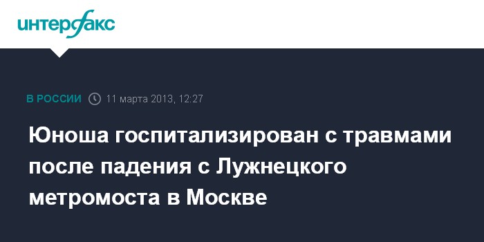 Москва. 11 марта. INTERFAX.RU- Молодой человек, упавший во время занятий паркуром (движение и преодоление препятствий различного характера), госпитализирован в одну из столичных больниц после падения с метромоста на Воробьевых горах, сообщил "Интерфаксу" источник в медицинских кругах столицы.