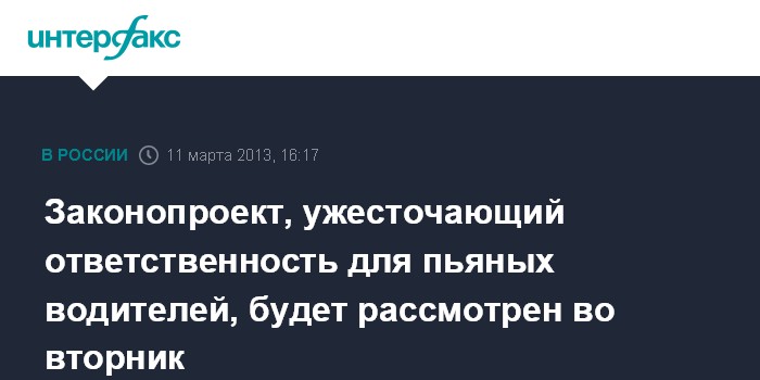 Москва. 11 марта. NTERFAX.RU - Госдума во вторник рассмотрит в первом чтении законопроект, ужесточающий ответственность за пьянство за рулем.