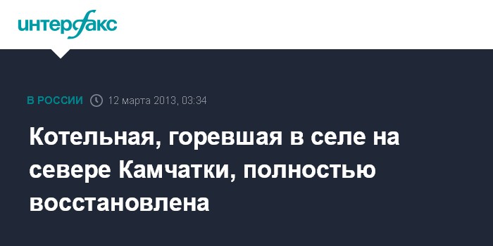 Петропавловск-Камчатский. 12 марта. ИНТЕРФАКС-ДАЛЬНИЙ ВОСТОК - Горевшая в селе Тиличики на севере Камчатки котельная "Гаражная" полностью восстановлена и работает в штатном режиме, сообщает во вторник пресс-служба правительства Камчатского края.