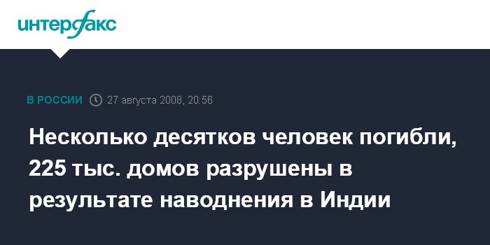 Дели. 27 августа. ИНТЕРФАКС - В результате наводнения, вызванного разливом реки Коси на северо-востоке Индии, погибли по меньшей мере 55 человек, 225 тыс. домов разрушены, сообщает в среду индийская газета "Таймс оф Индиа".