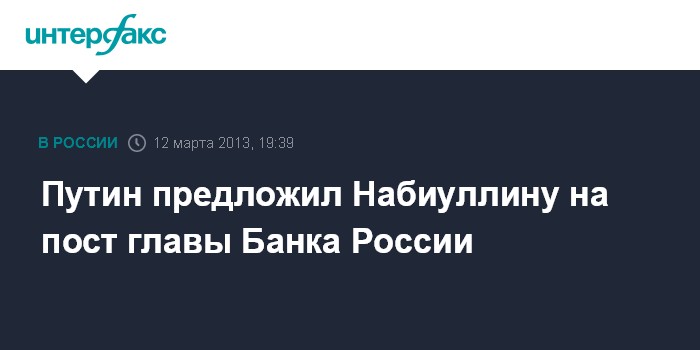 Ново-Огарево. 12 марта. INTERFAX.RU - Помощник президента РФ Эльвира Набиуллина предлагается на пост председателя Центрального банка России.