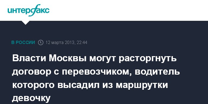 Москва. 12 марта. INTERFAX.RU - Столичный департамент транспорта и дорожно-транспортной инфраструктуры расторгнет договор с частным перевозчиком, обслуживающим маршрутное такси N333 в случае, если подтвердится информация о том, что водитель высадил на мороз девятилетнюю девочку, не нашедшую денег на проезд, сообщила пресс-секретарь департамента Алена Еремина.