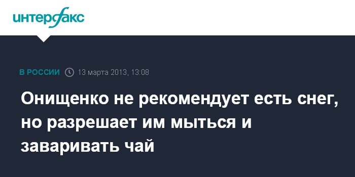 "По сути, снег - это дистиллированная вода. Из нее выпарились соли, загрязнения, а сама она в девственно чистом состоянии поднялась в небеса, превратилась в снег и упала на землю. Но у нас загазованный, загрязненный воздух, и она абсорбировала много нехорошего, поэтому есть его нельзя", - сказал Онищенко на пресс-конференции в центральном офисе "Интерфакса" в среду.