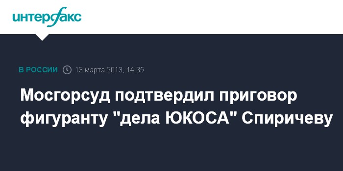 Москва. 13 марта. INTERFAX.RU - Мосгорсуд в среду оставил без изменений приговор в отношении бывшего руководителя подконтрольных НК "ЮКОС" предприятий Алексея Спиричева, который нижестоящей инстанцией был признан виновным в мошенничестве и уклонении от уплаты налогов.