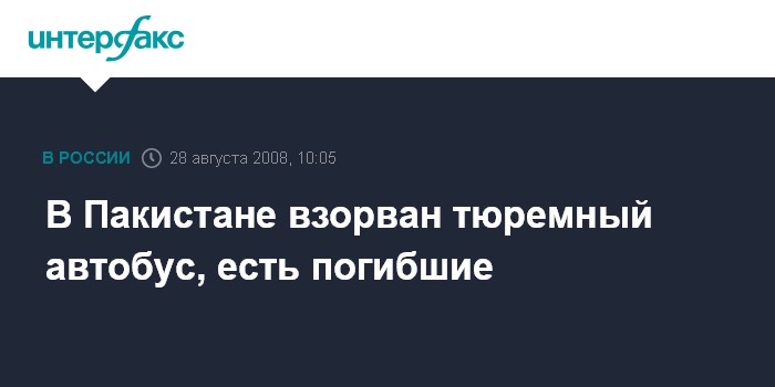 Москва. 28 августа. INTERFAX.RU - Не менее десяти человек погибли при нападении террориста-самоубийцы на тюремный автобус, сообщает в четверг пакистанский телеканал "Дон ТВ".