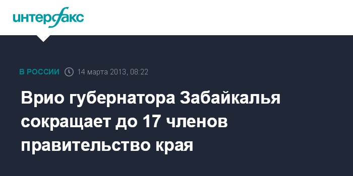 Чита. 14 марта. INTERFAX.RU - Врио губернатора Забайкальского края Константин Ильковский предложил парламенту региона сократить с 21 до 17 членов краевого правительства, сообщает пресс-служба губернатора.