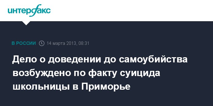 Владивосток. 14 марта. INTERFAX.RU - Следователи возбудили уголовное дело по факту самоубийства 13-летней школьницы в Приморье.