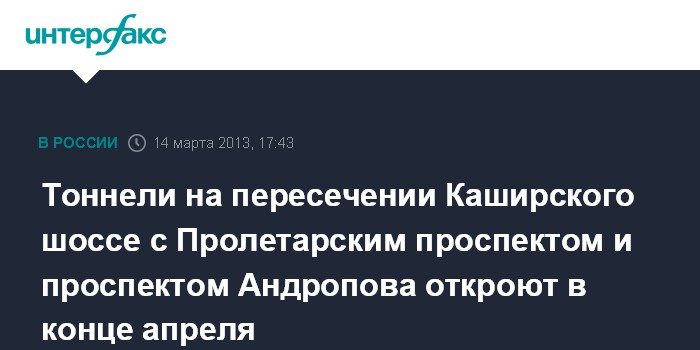 Москва. 14 марта. INTERFAX.RU - Движение по тоннелям на пересечении Каширского шоссе с Пролетарским проспектом и проспектом Андропова планируется запустить в конце апреля, сообщили в пресс-службе столичного департамента строительства