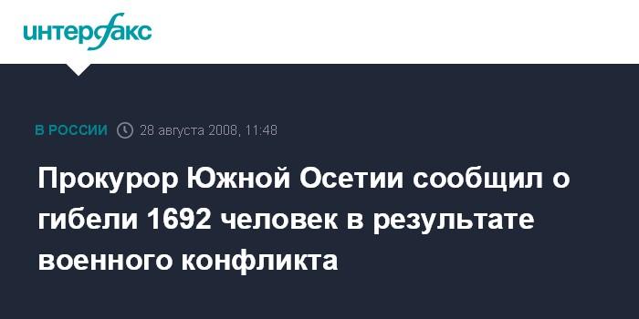 Москва. 28 августа. INTERFAX.RU - В рамках расследования уголовного дела о геноциде народа Южной Осетии установлена гибель 1692 человек, сообщил в четверг генеральный прокурор республики Теймураз Хугаев.