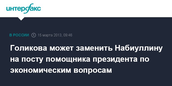 Москва. 15 марта. INTERFAX.RU - Эльвиру Набиуллину, кандидатура которой предложена президентом РФ Владимиром Путиным на пост главы Центробанка, в администрации президента может заменить ее коллега Татьяна Голикова, пишет газета "Ведомости" в пятницу.