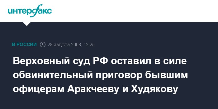 Москва. 28 августа. INTERFAX.RU - Верховный суд РФ оставил в силе приговор бывшим офицерам Внутренних войск Сергею Аракчееву и Евгению Худякову, осужденным на 15 и 17 лет заключения соответственно по обвинению в убийстве мирных жителей Чеченской республики.
