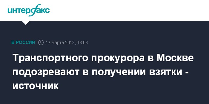 Москва. 17 марта. INTERFAX.RU - Один из столичных транспортных прокуроров проверяется на причастность к коррупционному преступлению в особо крупном размере, сообщил "Интерфаксу" в воскресенье осведомленный источник. "Накануне выходных был задержан на рабочем месте заместитель начальника Управления по контролю за исполнением законов на транспорте Московской межрегиональной транспортной прокуратуры Денис Евдокимов. Он подозревается в получении взятки на сумму в несколько миллионов рублей", - сказал собеседник агентства.