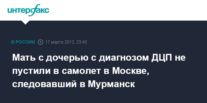 Москва. 18 марта. ИНТЕРФАКС - Мать с дочкой дошкольного возраста, которая страдает ДЦП и больна гриппом, не пустили в самолет во Внуково. Они следовали стыковочным рейсом Львов-Москва-Мурманск.