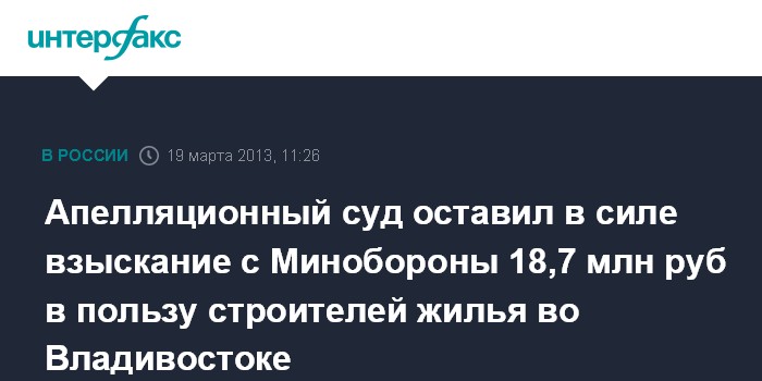 Владивосток. 19 марта. INTERFAX.RU - Пятый арбитражный апелляционный суд во Владивостоке подтвердил законность решения о взыскании с Министерства обороны 18,7 млн рублей за строительство жилого дома для военных во Владивостоке.