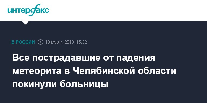 Челябинск. 19 марта. INTERFAX.RU - Последнюю пострадавшую от падения метеорита выписали из горбольницы N 6 Челябинска во вторник, сообщает пресс-служба министерства здравоохранения Челябинской области.