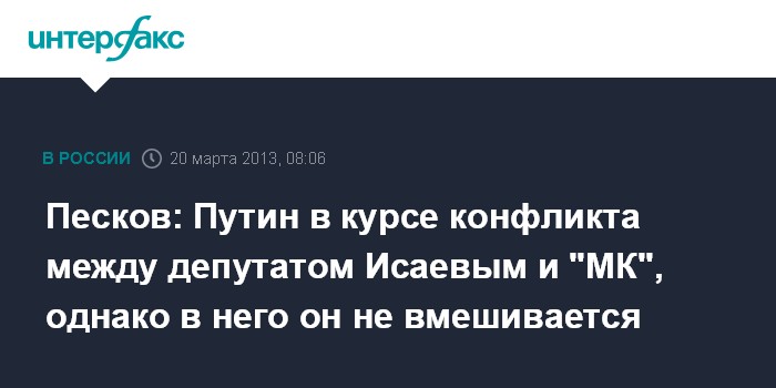 Москва. 20 марта. INTERFAX.RU - Пресс-секретарь президента РФ Дмитрий Песков заявил, что Владимир Путин в курсе ситуации вокруг депутата-единоросса Андрея Исаева и "Московского комсомольца", но пока "в нее не вмешивается".