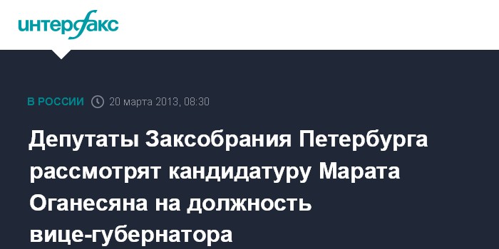 Санкт-Петербург. 20 марта. INTERFAX.RU - Законодательное собрание Петербурга в среду рассмотрит кандидатуру Марата Оганесяна на должность вице-губернатора.