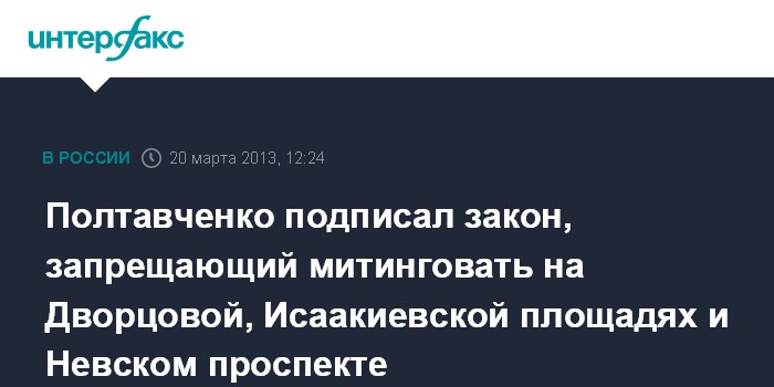 Санкт-Петербург. 20 марта. INTERFAX.RU - Губернатор Петербурга Георгий Полтавченко подписал в среду поправки к городскому закону "О собраниях, митингах и демонстрациях", которые запрещают проводить акции на Дворцовой, Исаакиевской площадях и Невском проспекте.