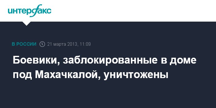 Москва. 21 марта. INTERFAX.RU - В Национальном антитеррористическом комитете заявили, что все боевики, которые были заблокированы в подвале дома в Махачкале, ликвидированы, погиб сотрудник спецназа ФСБ.