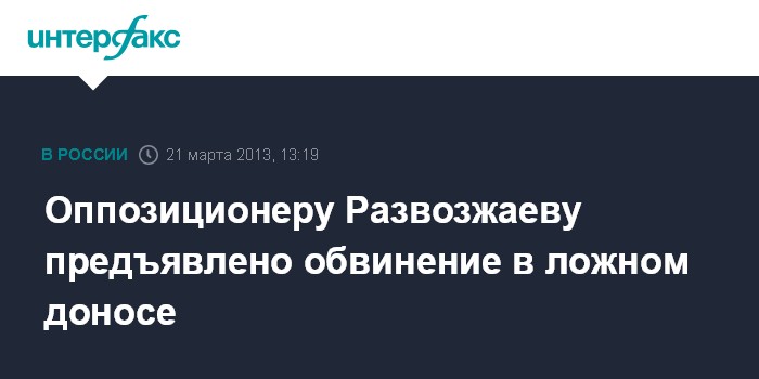 Москва. 21 марта. INTERFAX.RU - Оппозиционеру Леониду Развозжаеву предъявлено третье по счету обвинение - на этот раз в ложном доносе, сообщили "Интерфаксу" в пресс-службе СКР.