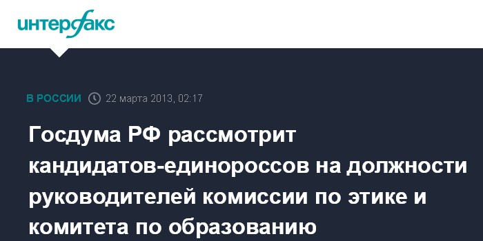 Москва. 22 марта. ИНТЕРФАКС - Госдума в пятницу рассмотрит кандидатуры депутатов-единороссов, предложенные на должности руководителей комиссии по этике и комитета по образованию.