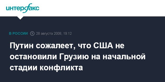 Москва. 28 августа. ИНТЕРФАКС - Премьер-министр РФ Владимир Путин выразил сожаление по поводу того, что Соединенные Штаты не вмешались в грузино-южноосетинский конфликт и не остановили грузинское руководство от его эскалации.