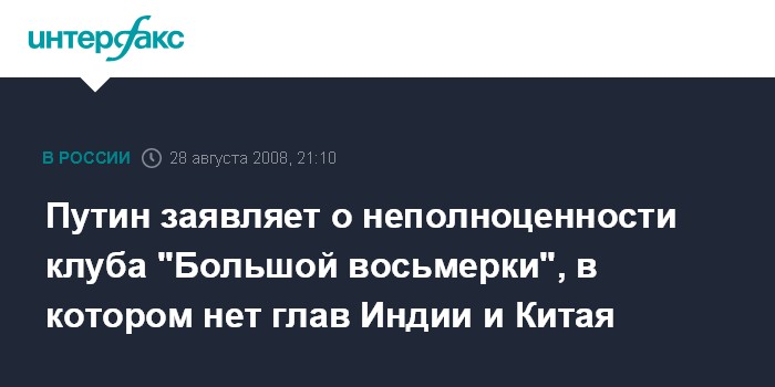 Москва. 28 августа. ИНТЕРФАКС - "Большая восьмерка" без Китая и Индии сегодня становится неполноценной, считает председатель правительства РФ Владимир Путин.