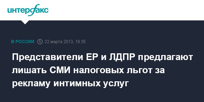 Москва. 22 марта. INTERFAX.RU - Депутаты Госдумы от "Единой России" и ЛДПР предлагают рассмотреть возможность отмены налоговых льгот для изданий, публикующих объявления эротического характера.