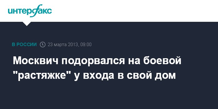 Москва. 23 марта. INTERFAX.RU - Москвич остался калекой после того, как его попытались подорвать на "растяжке", установленной на входной двери его же дома в Подмосковье, сообщили "Интерфаксу" в пресс-службе ГУ МВД России по Московской области.