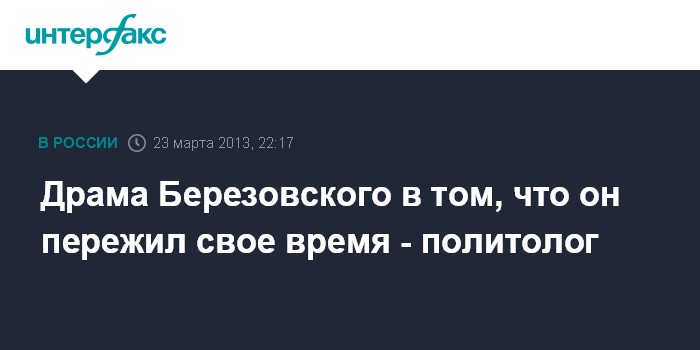 "О Борисе Абрамовиче (Березовском - ИФ), скорее всего, будут вспоминать, как о фигуре из истории 90-х годов. Он ощущал себя азартным игроком, которому явно недостаточно было предпринимательской деятельности. Березовский хотел большего: влиять на политическую ситуацию, увольнять министров и прочее. И с такими амбициями Березовский прожил до конца своих дней. Его драма, пожалуй, в том, что он пережил свое время", - заявил А.Макаркин в субботу "Интерфаксу".