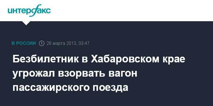 Хабаровск. 26 марта. ИНТЕРФАКС-ДАЛЬНИЙ ВОСТОК - Полиция на станции Джамку Хабаровского края задержала безбилетника, угрожавшего взорвать вагон пассажирского поезда.