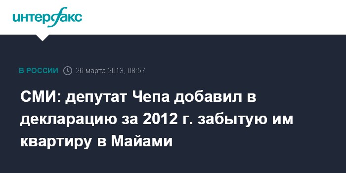 "Ведомости" сообщают, что, помимо квартиры в США, в декларации за 2012 г. Чепа отметил не указанные за 2011 г. счета: несколько "нулевых" счетов (открыты в 2011 г.) и один с 4022 руб. (открыт в 2001 г.) в российских банках, а также несколько - в кипрских банках.