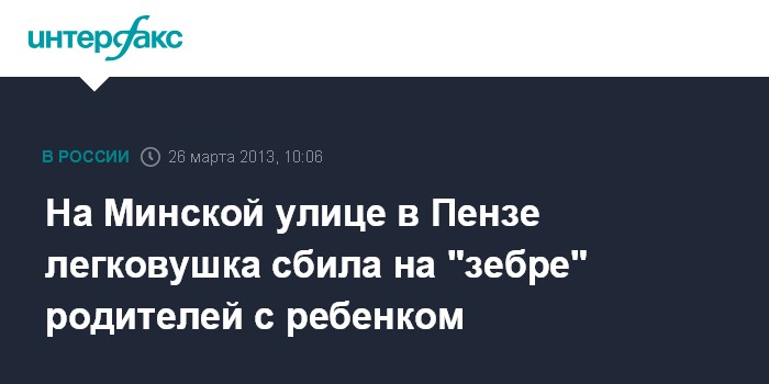 Пенза. 26 марта. INTERFAX.RU - В Октябрьском районе Пензы на нерегулируемом пешеходном переходе автомобиль ВАЗ-2108 сбил трех человек - родителей с 3-летней дочкой, сообщает пресс-служба регионального УГИБДД во вторник.