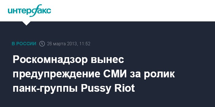 Как говорится в сообщении ведомства, распространенном во вторник, предупреждение вынесено редакции и учредителю электронного периодического издания "Питер.ТВ (Piter.TV)" (Санкт-Петербург) за размещение в сети "Интернет" видеоролика панк-группы Pussy Riot, признанного судом экстремистским материалом.