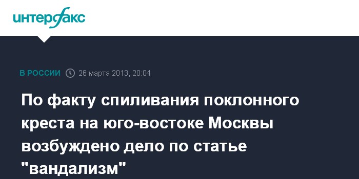 "По факту обнаружения поклонного креста, обнаруженного спиленным во вторник утром на Краснодарской улице в столичном районе Люблино, возбуждено уголовное дело по статье 214 УК РФ ("Вандализм")", - сказал сотрудник пресс-службы.