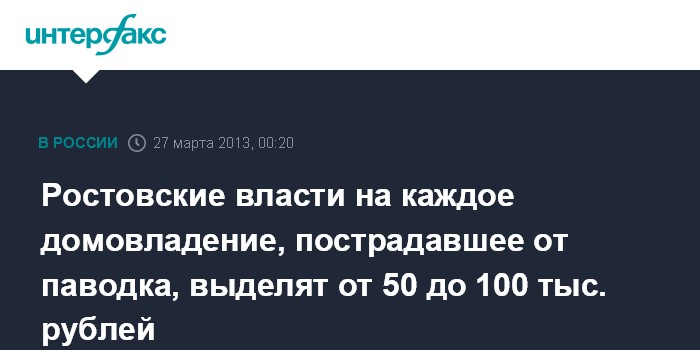 "На каждое домовладение, которое оказалось в зоне подтопления и пострадало от паводка, власти региона выделят от 50 до 100 тыс. рублей. Будет оказана помощь и местным жителям. Они получат 5 тыс. на человека", - подчеркнул В.Голубев.