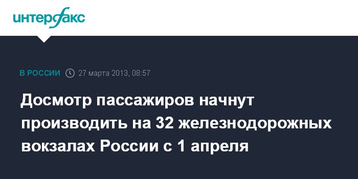 Москва. 27 марта. INTERFAX.RU - С 1 апреля на 32 российских железнодорожных вокзалах в тестовом режиме начнут действовать досмотровые зоны для пассажиров, на обустройство которых было потрачено более 1 млрд рублей, пишет "Коммерсант" в среду.