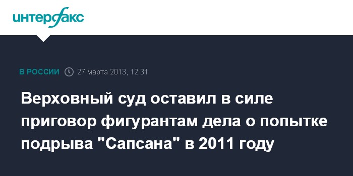Москва. 27 марта. INTERFAX.RU - Верховный суд РФ в среду признал законным приговор фигурантам дела о попытке подрыва скоростного поезда "Москва - Санкт-Петербург" летом позапрошлого года.