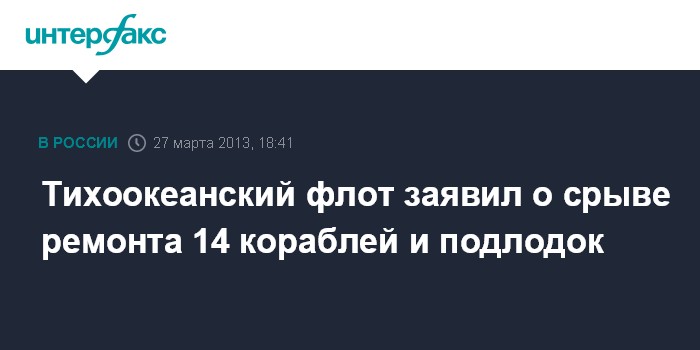 Москва. 27 марта. INTERFAX.RU - Дальневосточный центр судостроения и судоремонта сорвал установленные контрактами сроки выполнения ремонта 14 кораблей и подводных лодок, которые он должен был передать флоту до конца 2012 года, сообщил в среду "Интерфаксу" высокопоставленный источник со стороны заказчика - Минобороны РФ.