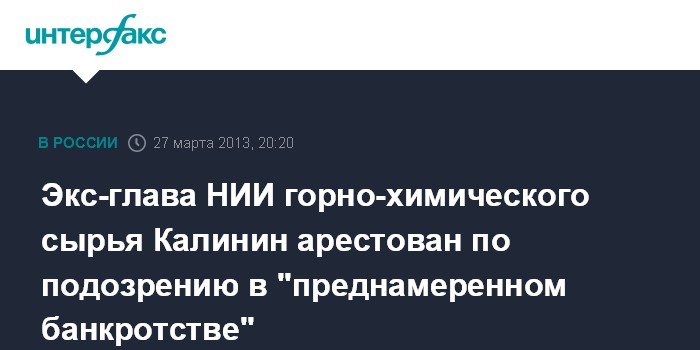Экс-глава НИИ горно-химического сырья Калинин арестован по подозрению в "преднамеренном банкротстве"